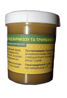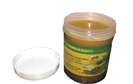 Мазь от варикоза и тромбофлебита, емкостью 100 гр. В пчелином подморе есть такие целебные свойства, которые помогают снять отечность и облегчить дискомфорт при ходьбе, при варикозном расширении вен. Это обусловлено тем, что пчелы являются носителем, таких элементов, как гепарин, который избавляет от воспалительных процессов, восстанавливает кровообращение и оказывает благотворное влияние на состояние сосудов в организме. Помимо этого в покровы пчел входит комплекс биологически активных компонентов, стимулирующих иммунные процессы и улучшающие реакцию организма на вредные факторы окружающей среды. Также подмор богат антиоксидантами, которые в организме человека предотвращают развитие мутаций и замедляют процесс старения клеток. В частности на предотвращение развития варикозного расширения вен, а также в профилактических целях, принимают пчелиный подмор, который богат гепароидами или натуральными антикоагулянтами крови. Благодаря гепароидам есть возможность лечения различные воспалительных процессов, а также стабилизировать кровяное давление, значительно улучшить состояние сосудов, избавиться от тромбоза и тромбофлебитов головного мозга.