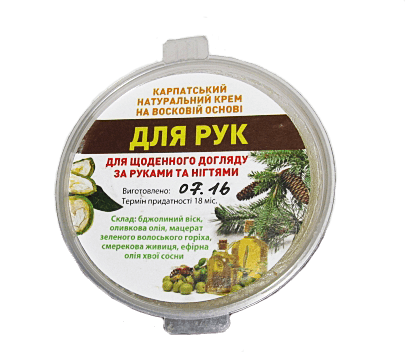 Карпатский натуральный крем на восковой основе. Для ежедневному ухода за руками и ногтями. Он обладает легкой текстурой, которая великолепно питает и смягчает кожу. Натуральные компоненты крема обеспечивают великолепный оздоровительный эффект.
