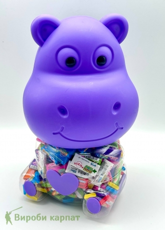 Яркий бегемотик с сюрпризом внутри! Внутри — разноцветные жевательные резинки с тату, которые подарят детям радость и веселье. Отличный вариант для подарка или сладкого угощения