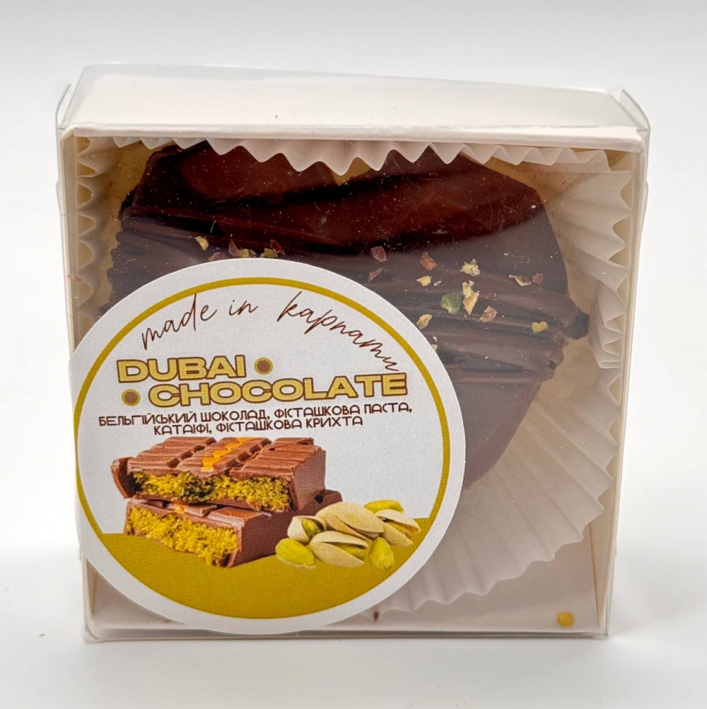 Эксклюзивная ручная конфета на основе бельгийского шоколада с фисташковой пастой, нежной хрустящей вермишелью кадаиф и фисташковой крошкой. Восточное вдохновение с карпатским акцентом.