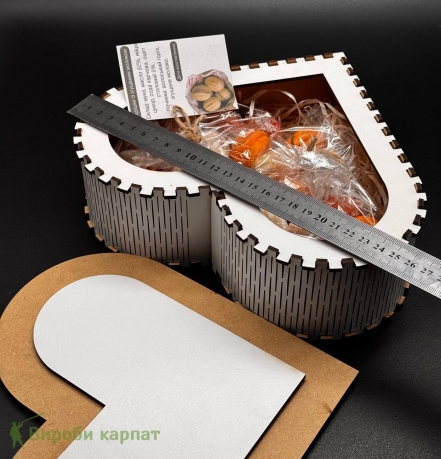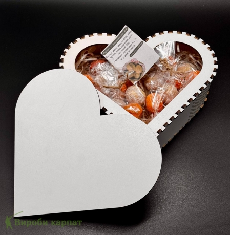 Подарочный набор в стильной фанерной коробке в форме сердца. Внутри – вкусное домашнее печенье "Орехи" с нежной начинкой. Идеальный выбор для подарка или угощения к чаю.