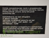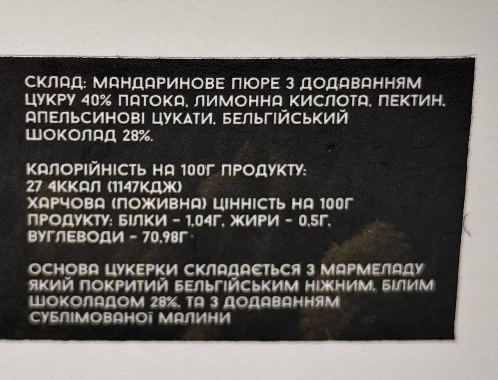 Состав: мандариновое пюре с добавлением сахара (40%), патока, лимонная кислота, пектин, апельсиновые цукаты, бельгийский шоколад 28%, сублимированная малина.