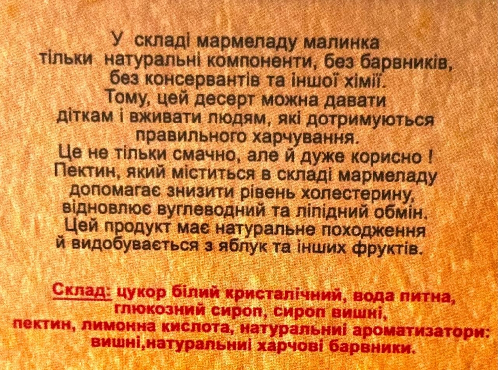 Состав: белый кристаллический сахар, питьевая вода, глюкозный сироп, вишневый сироп, пектин, лимонная кислота, натуральные ароматизаторы (вишня), натуральные пищевые красители.