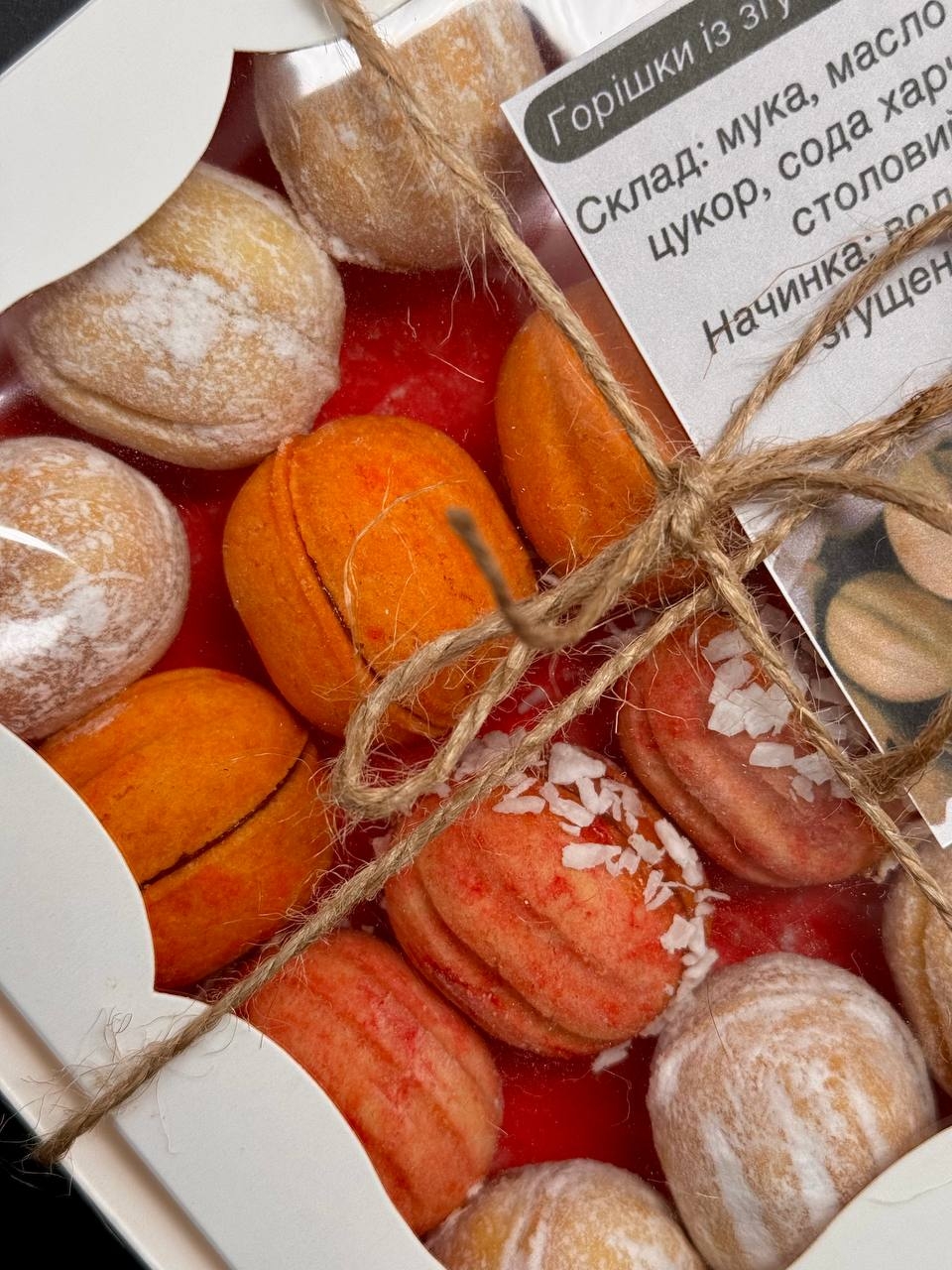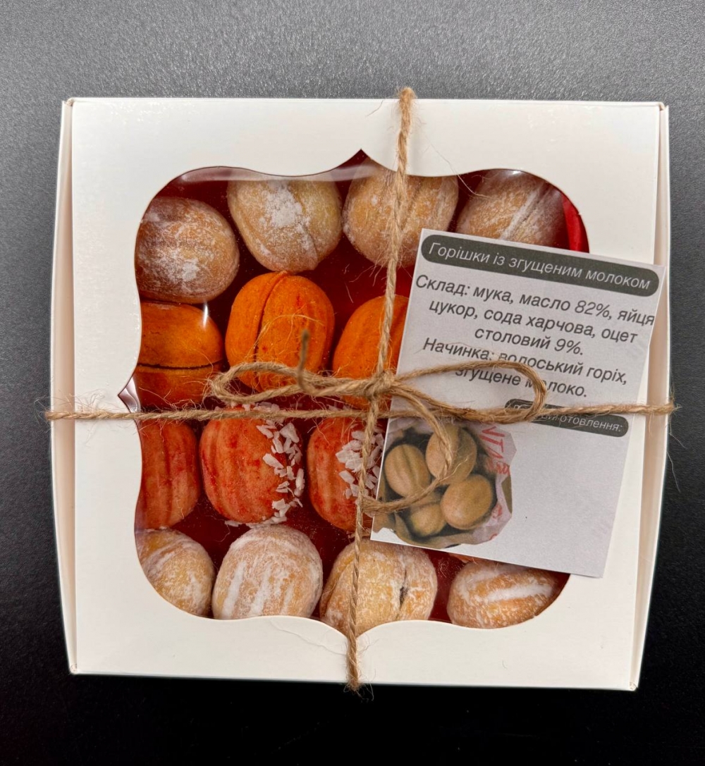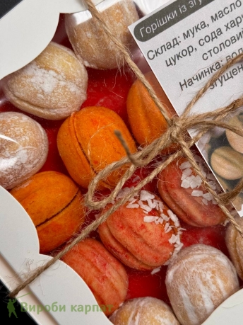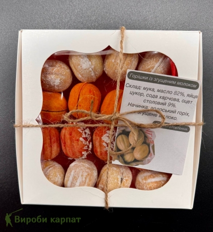 Вкусное домашнее печенье "Орехи" с нежной начинкой из грецкого ореха и сгущённого молока. Каждое печенье изготовлено вручную из натуральных ингредиентов. Идеальный выбор для подарка или сладкого угощения. Упаковано в стильную подарочную коробку.