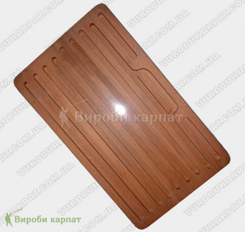Разделочная доска из бука. Размером 22х37см, предназначена для нарезки хлеба. Имеет специальные канавки, для крошек от хлеба. Которые легко удаляются при перевороте доски. Доска сделана из высушенного материала, влажностью древесины около 10%. Поставляется в термоусадочной плёнке, благодаря чему доска защищена от внешней среды. Для повышенной устойчивости к деформациям, доска сделана из планок, котрые склеены между собой против волокон друг к другу.