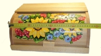 Деревянная хлебница необходима для каждой кухни, в каждом доме. Выполнена в классическом дизайне. Ручная работа. Изготовлена из натурального дерева – карпатский бук. Декорированая росписью.Размер 37 см х 27 см, высота 17см. Экологически чистое.