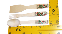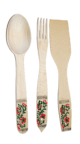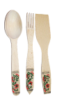 Деревянный кухонный набор, с элементами художественной росписи. Деревянный кухонный набор – это незаменимая вещь на каждой кухне. Состоит из трех предметов – лопатки, вилки и ложки. Они толстые и твердые, их можно использовать для перемешивания, погружения, сферического коробления, дегустации или подачи на стол. Кроме этого, дерево естественно подавляет рост бактерий, что делает деревянную посуду абсолютно безопасной для здоровья.