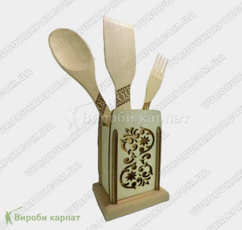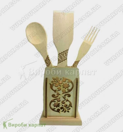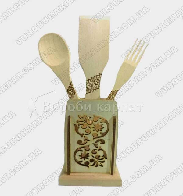 Кухонный набор вышиванка, состоит из подставки, сделанной из фанеры и бука, лопатки, евро ложки, вилки. Приборы украшены выжиганием традиционной украинской вышиванкой. Отличный подарок, сувенир, который украсит кухню.