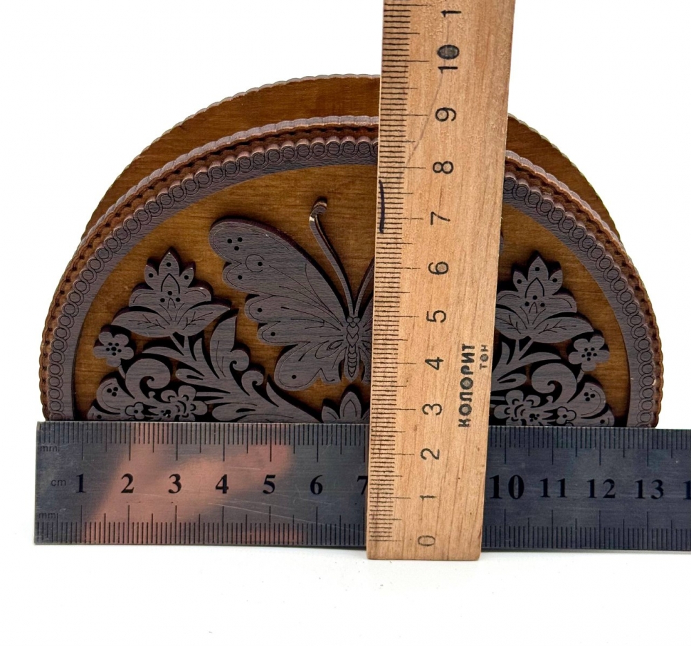 Декоративная деревянная салфетница с многослойной резьбой и узором в виде бабочки. Аккуратная лазерная резка, объёмные элементы и изящная форма делают её стильным дополнением кухни или праздничного стола