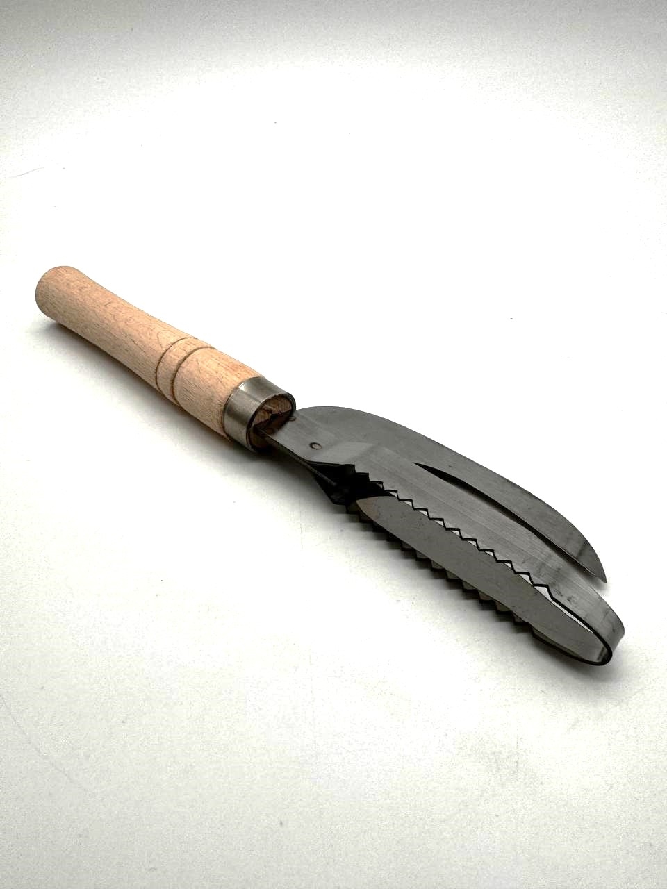 Нож для чистки рыбы, специализированный кухонный инструмент с узким острым лезвием и отдельными зубцами, предназначенный для удаления чешуи и обработки рыбы. Его эргономичная рукоятка обеспечивает удобный захват, а форма лезвия позволяет легко чистить рыбу даже в труднодоступных местах, сохраняя при этом целостность филе.