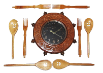 Wall Clock - is an elegant design element of any room. Have clocks - it's not just the original decision of the interior, but also functionality. Kitchen clock with elements of woodcarving, with original compositions from kitchen accessories.