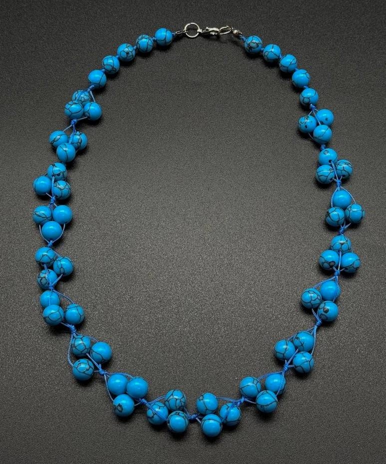 A necklace of bright blue beads made of dyed stone with a characteristic natural pattern. The stone imitates turquoise, creating a fresh, expressive accent in the image. Light and decorative, this necklace will harmoniously complement both everyday and festive styles