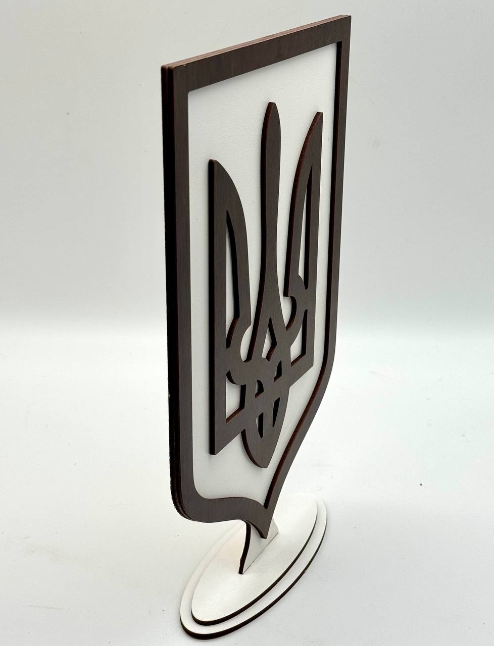 A stylish table coat of arms of Ukraine with the Trident. The product has a neat stand and is suitable for installation on a desktop, shelf or in the interior of the office. The combination of contrasting colors gives the product an elegant and modern look.