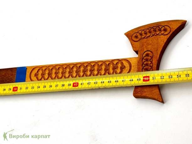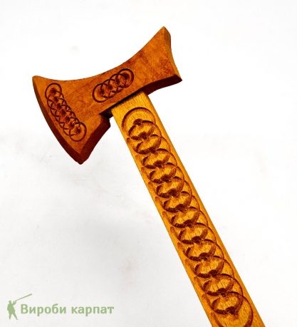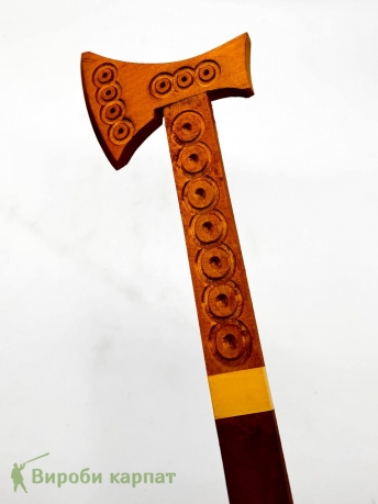 Exclusive decorative handmade axe made from natural wood. The item features intricate carving with traditional ethnic motifs. Perfect as a souvenir, gift, or interior decoration element. Finished with environmentally friendly materials.