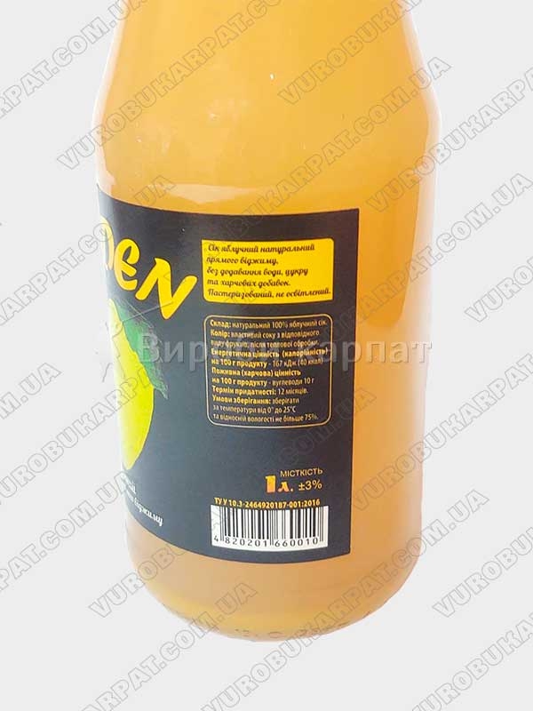 Apple juice 1 liter of natural direct extraction without the addition of water, sugar and food additives, pasteurized, not clarified. Ingredients: 100% natural apple juice