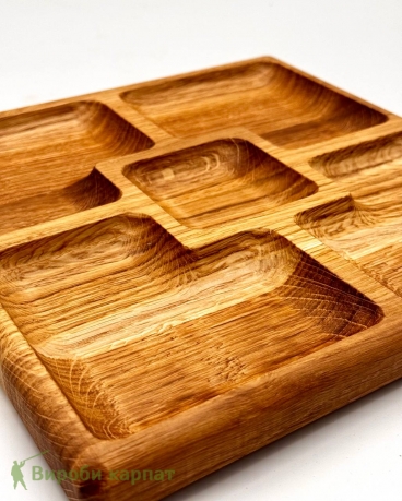 Square wooden tray with five compartments, ideal for serving snacks, nuts, sauces, or sweets. Made from solid oak, sanded smooth and finished with food-safe oil. Perfect for home, restaurant, or outdoor use.