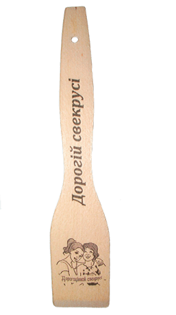 Kitchen spatula souvenir. With a printed drawing and the inscription "Dear mother-in-law". If you really want to please your mother-in-law, it's better to give her something that is actually pleasant and will be useful. As an inexpensive gift for the house you can give a kitchen shovel with a name inscription. Cozy looks and fits into any kitchen as a design or it can be used for its intended purpose.
