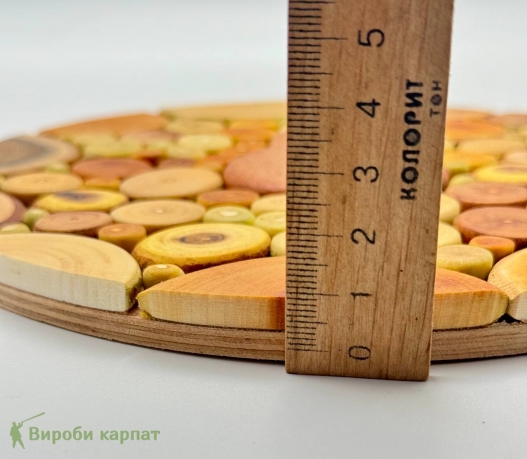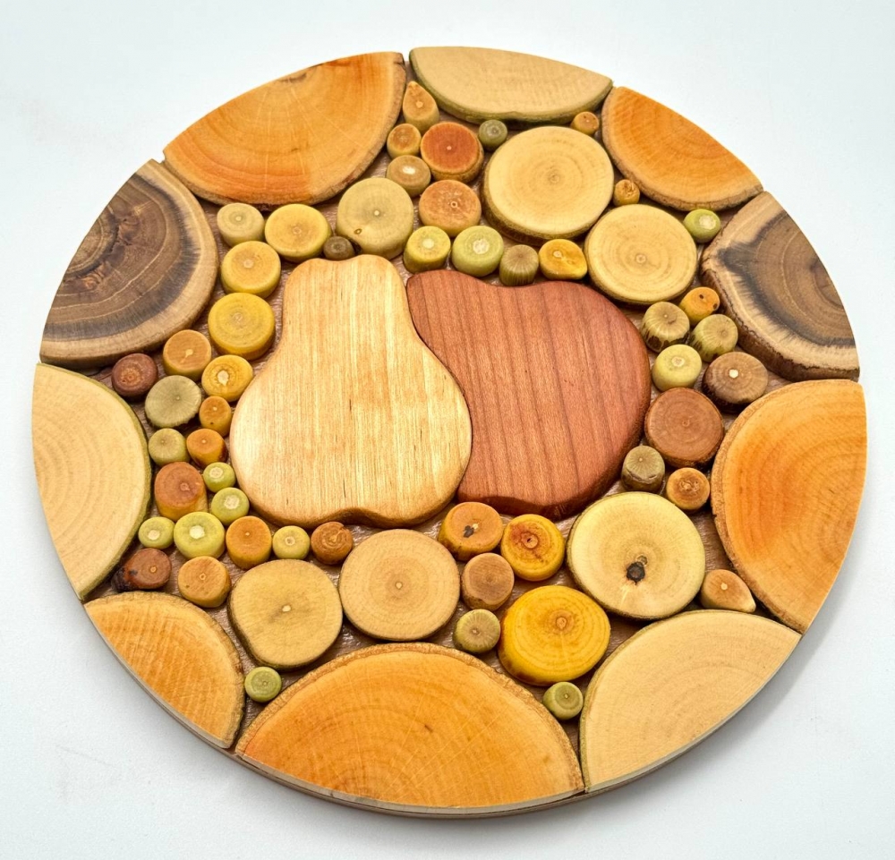 Unique handmade trivet crafted from natural wood slices of various species. Perfect for hot dishes, serving, or as a rustic home décor element. Features pear and apple shapes in the center for added charm. Coated with protective varnish.