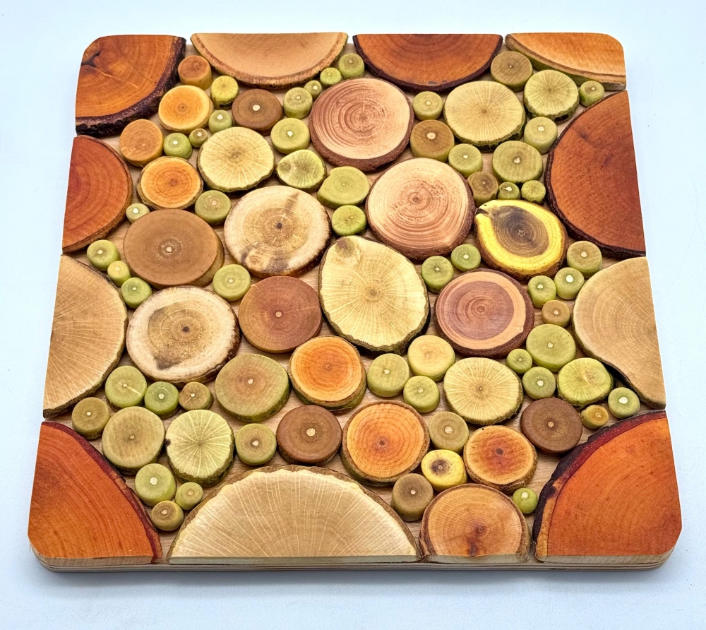 A large square stand made of natural wood slices is a practical and at the same time decorative element for the kitchen. The harmonious combination of different types of wood creates a unique mosaic pattern with a natural texture and annual rings. Perfect as a stand for hot dishes, a saucepan, a kettle or as a stylish accent in the home.