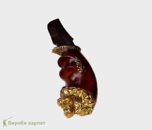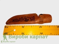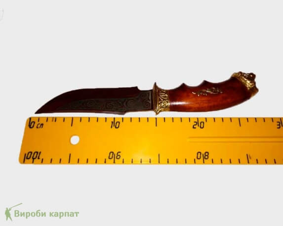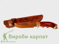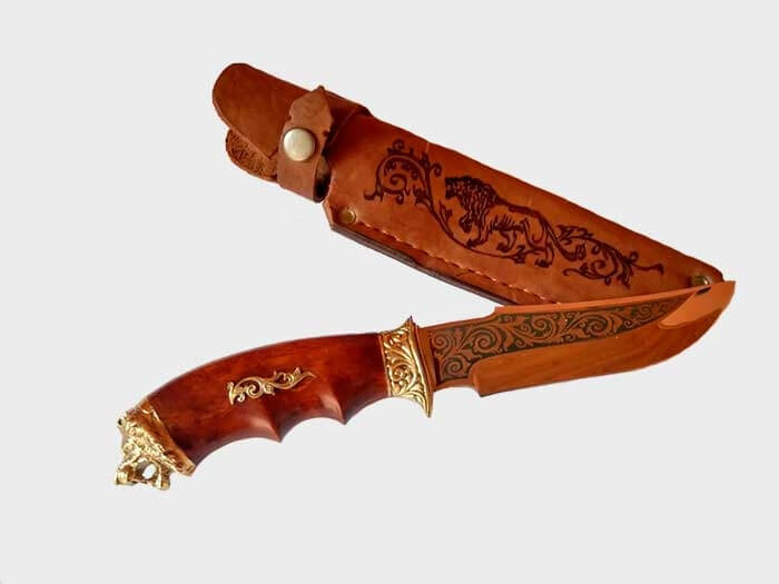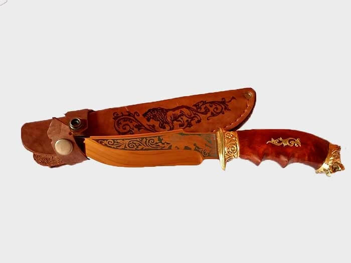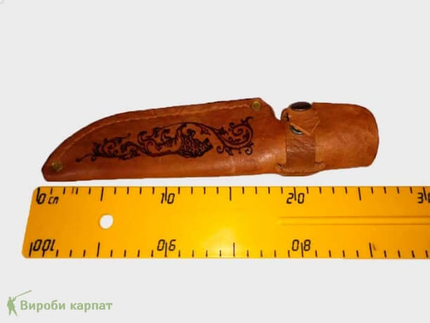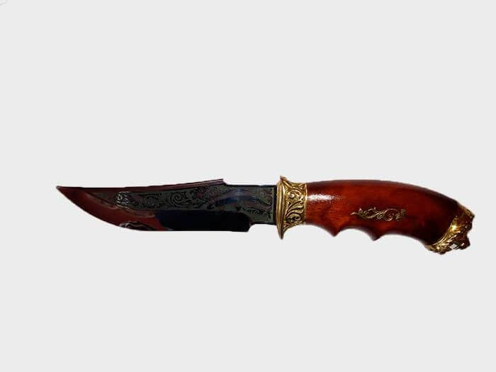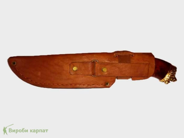 Охотничий нож ручной работы, с использованием высококачественных материалов. Сталь имеет твёрдость 58-62% по шкале Роквела. Кромка режущей части имеет 15 градусов, благодаря чему нож отлично удерживает заточку, легко поддаётся правке. Деревянная ручка, украшенная металлическим декором, качественно подогнана под лезвие ножа. В комплекте с кожаным чехлом, который удобно крепится на ремень.