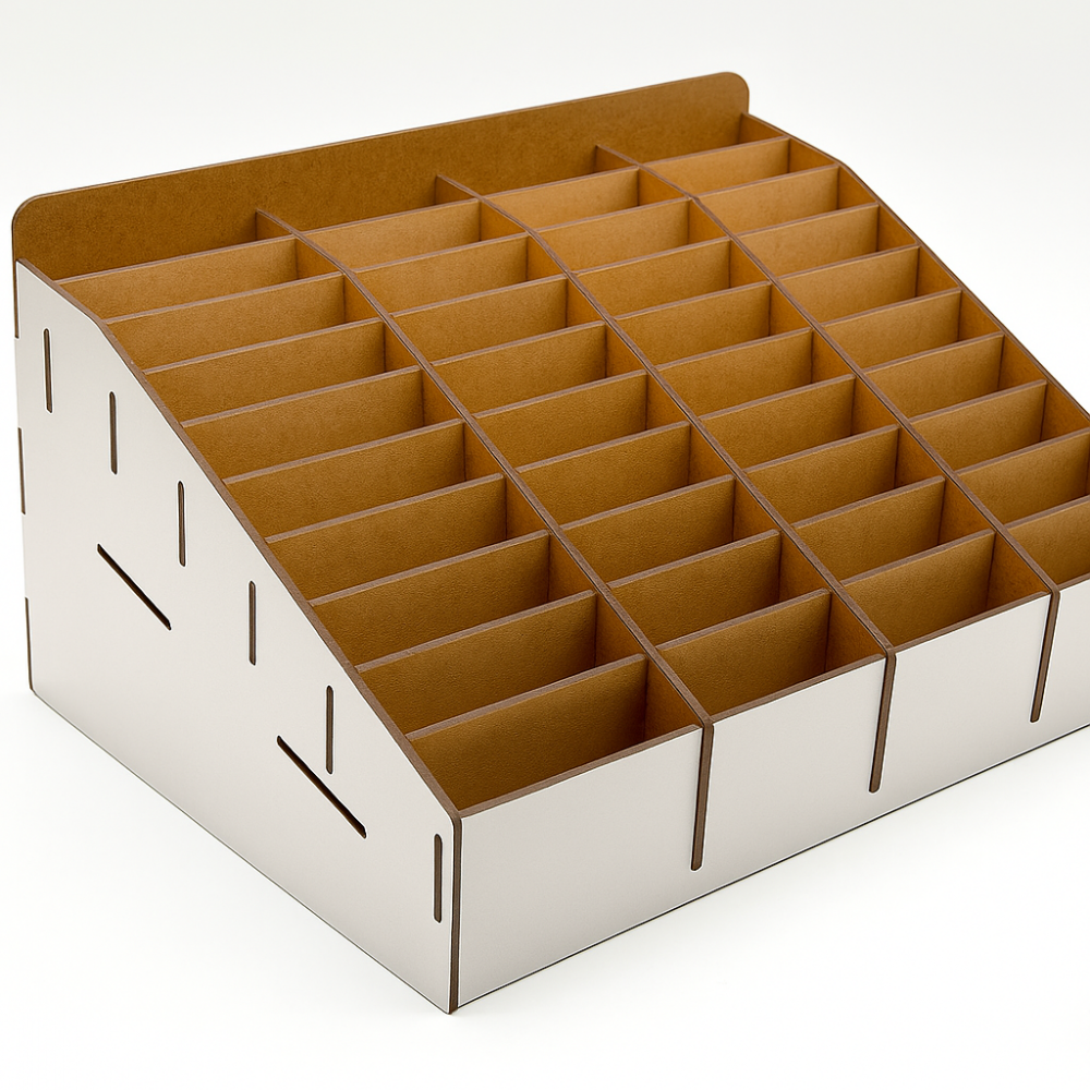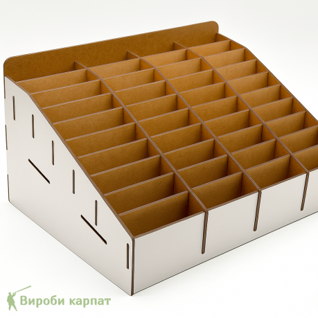 Функциональная и стильная подставка на 48 ячеек — отличное решение для демонстрации мобильных телефонов, хранения гаджетов, powerbank-ов и других мелких девайсов. Благодаря наклонной конструкции, каждый ряд хорошо просматривается, что особенно удобно для магазинов, шоурумов и мастерских.