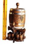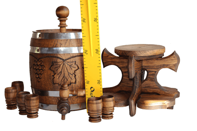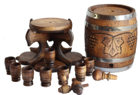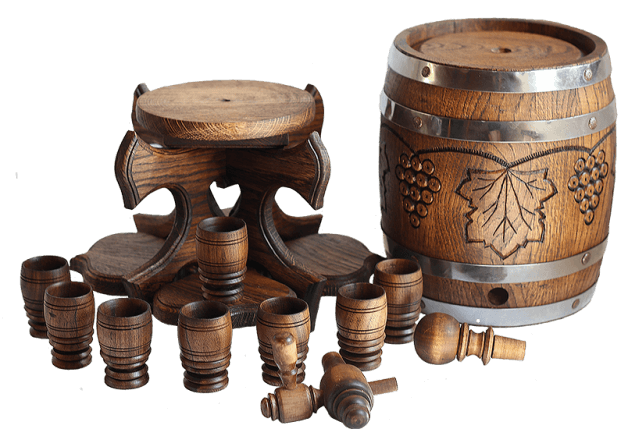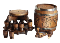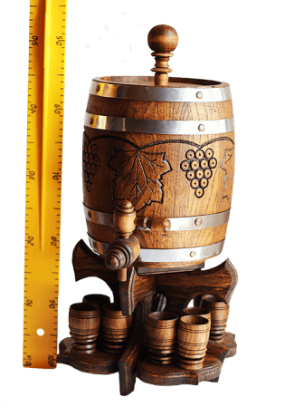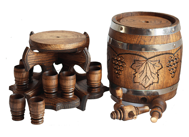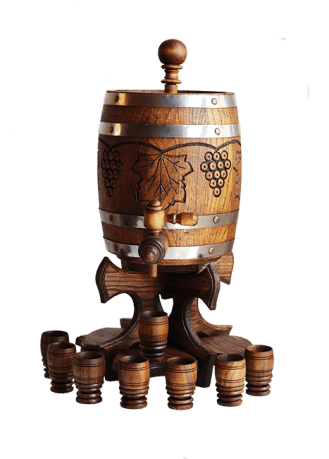 Резная бочка из дуба, ёмкостью 5 литров, с подставкой и деревянными стаканчиками в количестве 8 шт. Дубовая бочка – классическая емкость для приготовления вина. Дубовая бочка с набором кружек, с аутентичным краником и железными обручами – настоящая королева коньячного производства и виноделия. Аромат благородных напитков, их цвет и уникальный вкус полностью зависят от того, в каких условиях хранятся и вызревают, и нет ничего лучше для удовлетворения всех условий, как сувенирная дубовая бочка для вина.