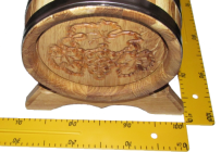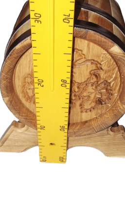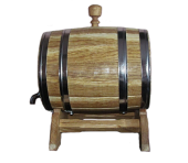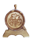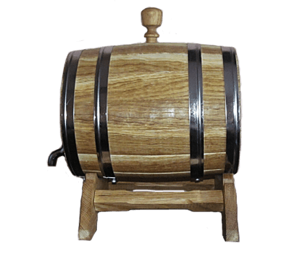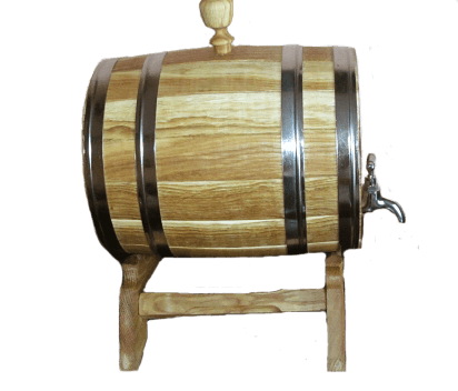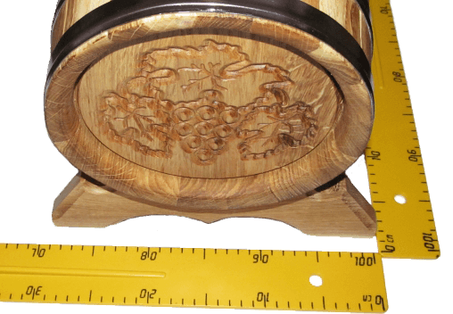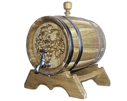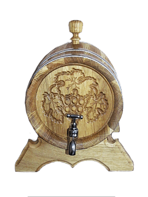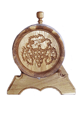 Дубовая бочка с нержавеющими обручами, объёмом 5л. Украшена резным виноградным листом. Не смотря на подарочный внешний вид ― это настоящая, функциональная, дубовая бочка. Дубовая бочка с художественным оформлением ― отличный подарок для здоровья, красоты, а также для дизайна помещения.