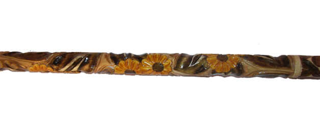 Деревянная трость ручной роботы. Украшена росписью и пластической резьбой по дереву. Теплый цвет, удачная форма, красивая текстура древесины. Трости для ходьбы, выполняемые мастерами в ручную, это можно сказать олицетворение эстетического изящества тех образов, которые используются при формировании рукоятей тростей.