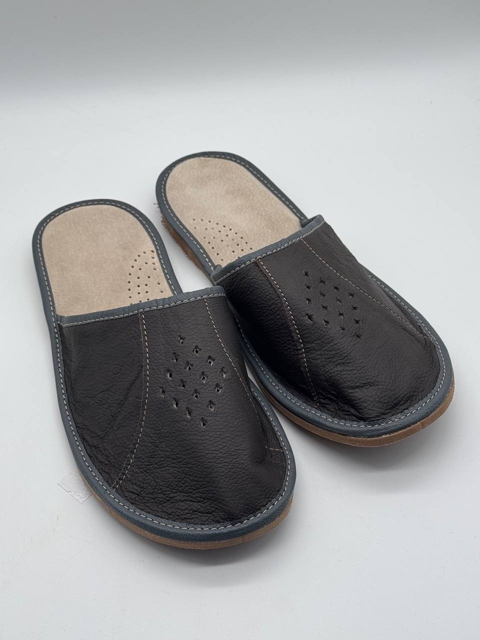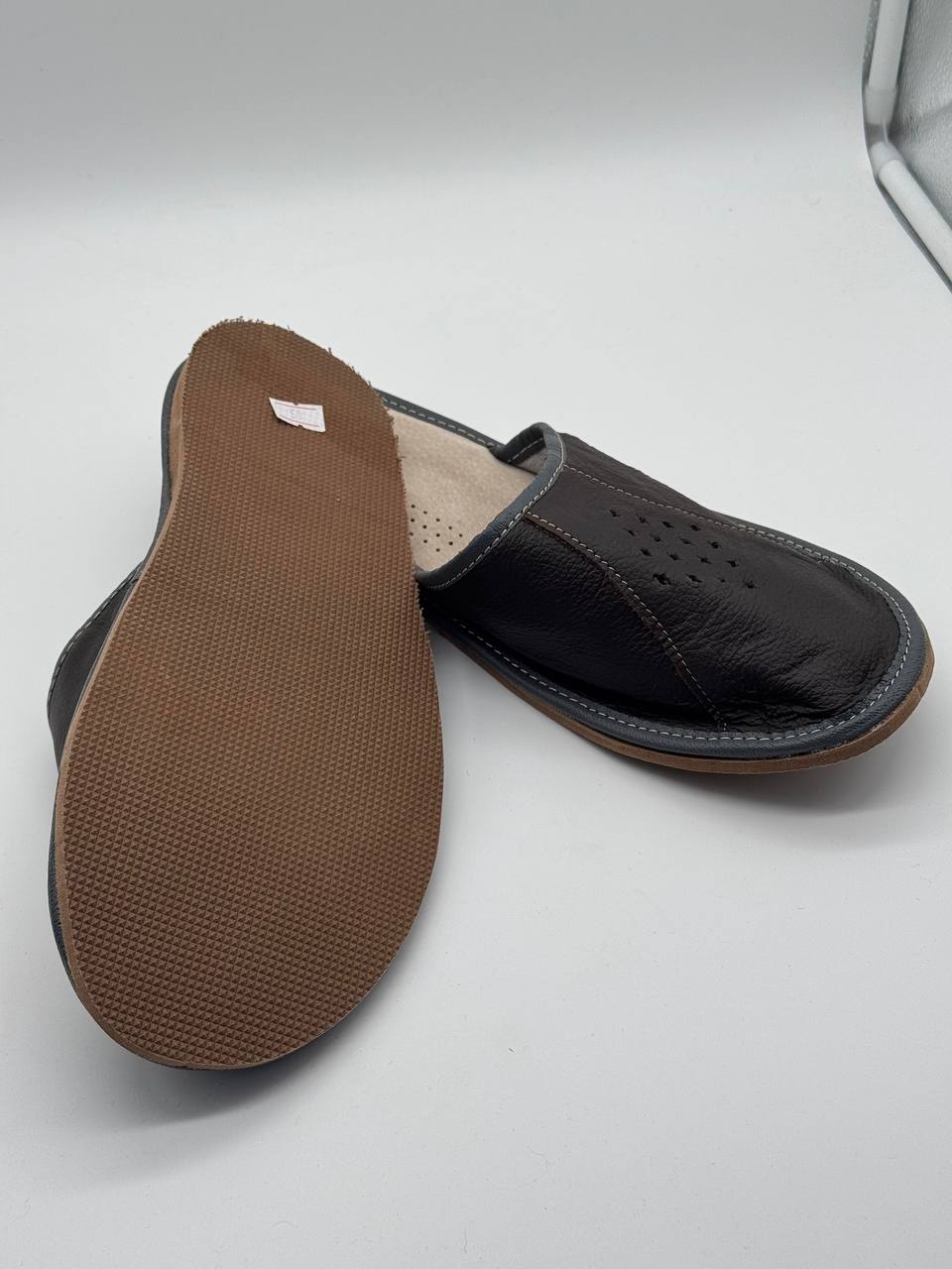 Натуральные кожаные тапочки, изысканная и комфортная обувь, изготовленная из высококачественной натуральной кожи. Они обеспечивают отличную вентиляцию, позволяя ногам дышать, и очень удобны для ежедневного ношения. Мягкая подкладка дарит чувство комфорта, а гибкая подошва обеспечивает надежную поддержку. Такие тапочки сочетают стиль и функциональность, что делает их идеальными для дома или отдыха.