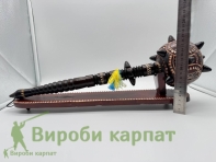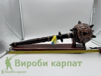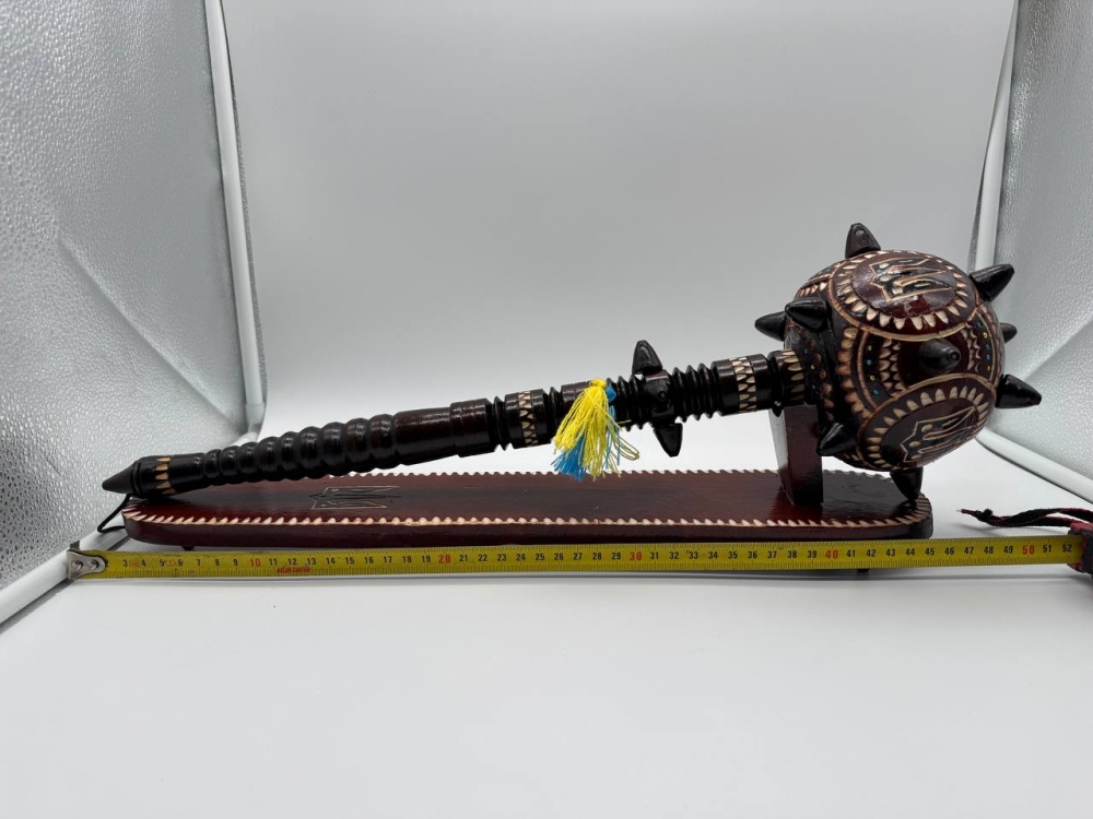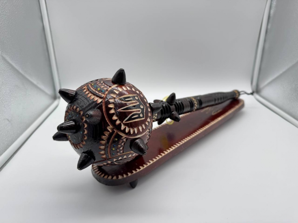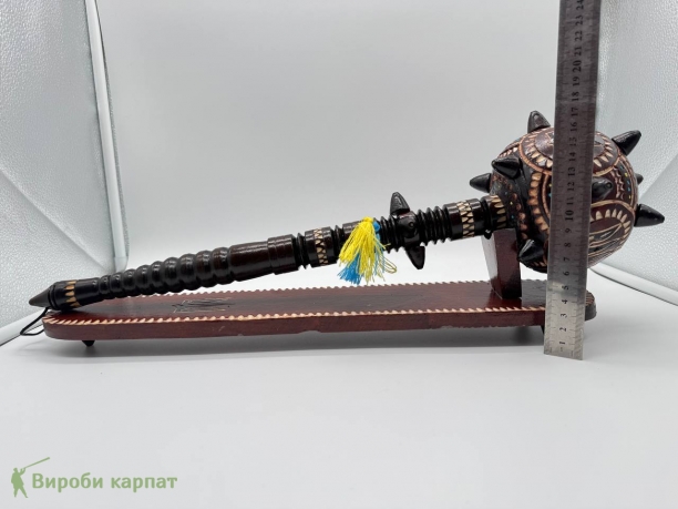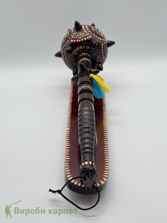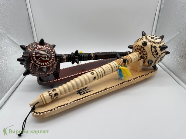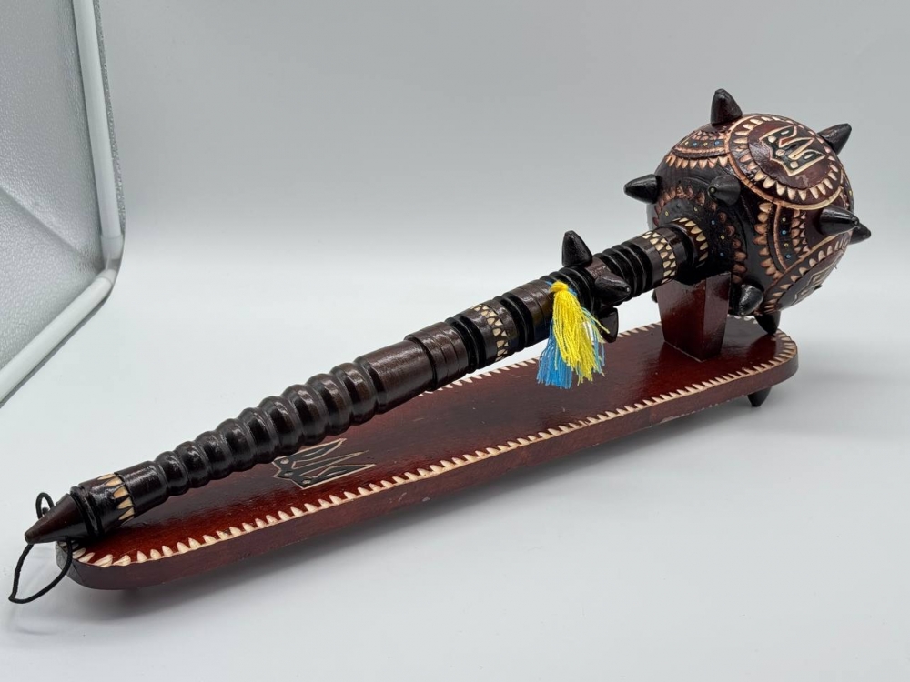 Сувенирная деревянная булава на подставке, символический аксессуар, олицетворяющий силу, мудрость и власть. Изготовлена из натурального дерева, часто украшена резьбой или декоративными элементами. Подставка придает ей стойкость и подчеркивает презентабельность. Такой сувенир станет отличным подарком или украшением интерьера в украинском стиле.