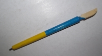 Деревянная шариковая ручка, имеет перо, для работы с пластилином. Ручка украшена гербом Украины.
