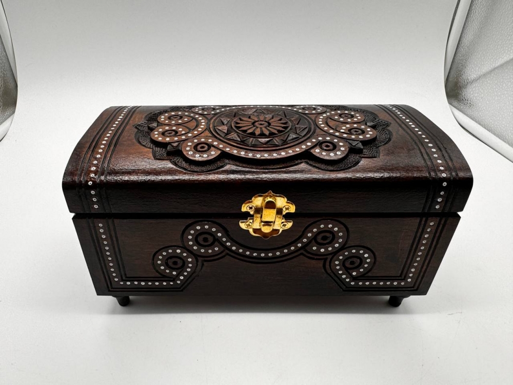 Деревянная резная шкатулка с бисером ручной работы, экологически чистый продукт, изготовленный из натурального дерева. Шкатулка украшена изящными резными узорами и инкрустирована бисером, что придает ей особый шарм и уникальность. Она идеально подходит для хранения украшений, сувениров и других мелочей. Ручная работа обеспечивает высокое качество исполнения, а натуральные материалы – безопасность для здоровья и долговечность.