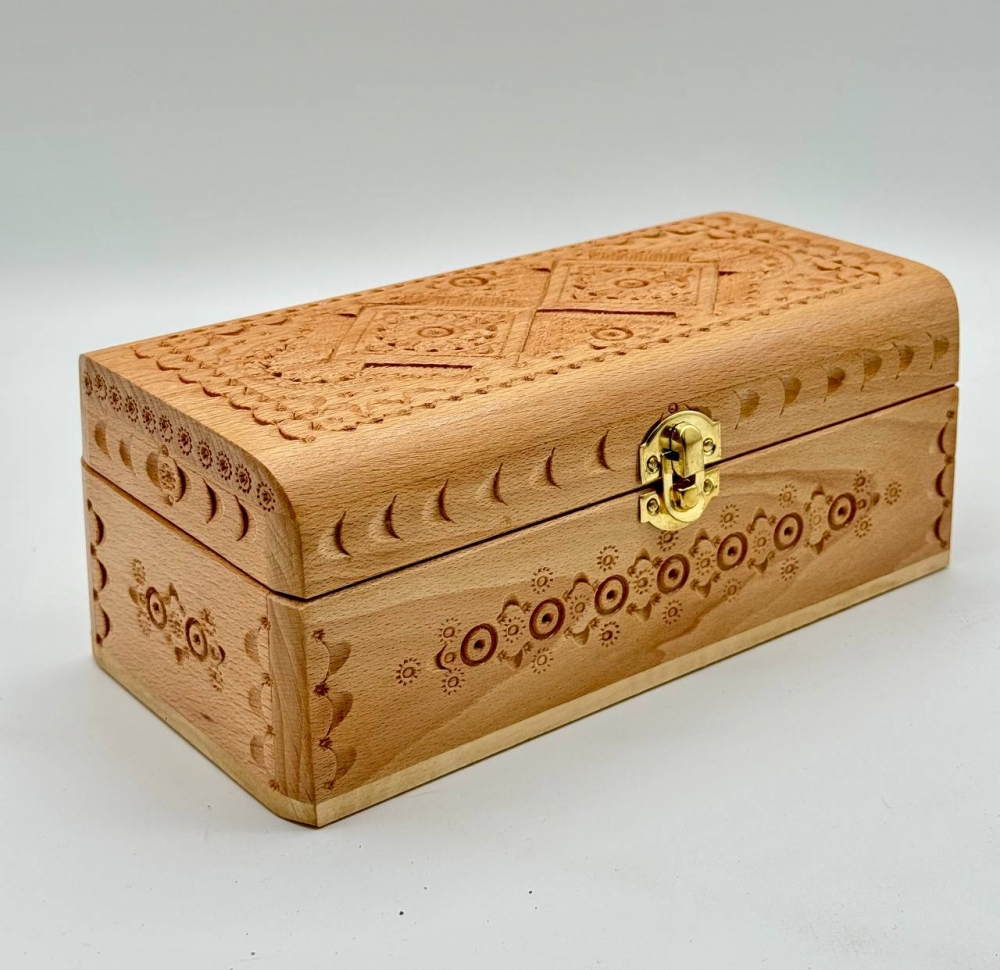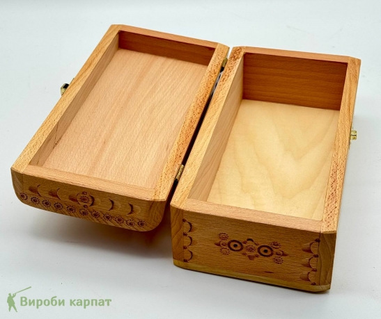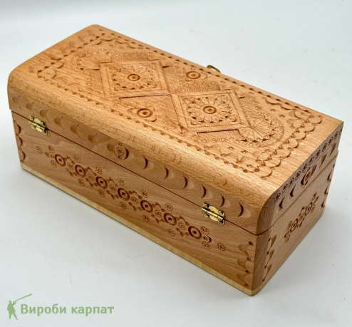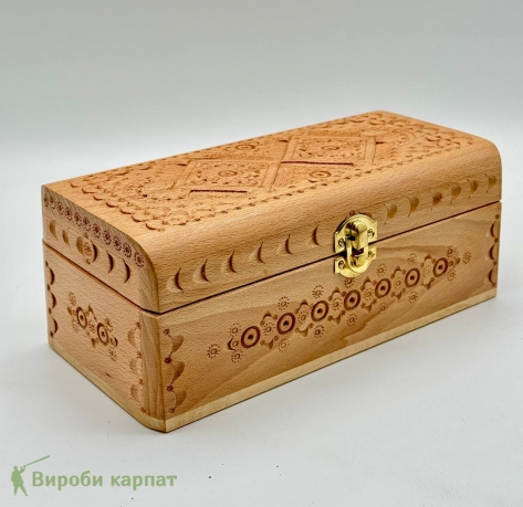 - Элегантная деревянная шкатулка ручной работы с изысканным карпатским орнаментом. Подходит для хранения украшений, купюр и сувениров. Натуральный бук и металлическая фурнитура обеспечивают долговечность и стильный внешний вид.
