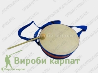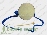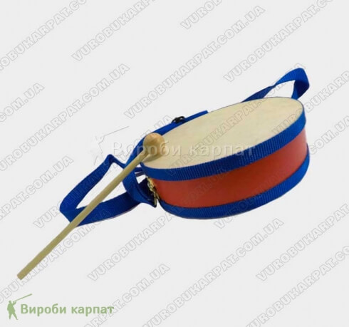 Детский барабан. На деревянной основе, имеет регулировку ремня, для удобства игры. В комплекте одна деревяная палочка.