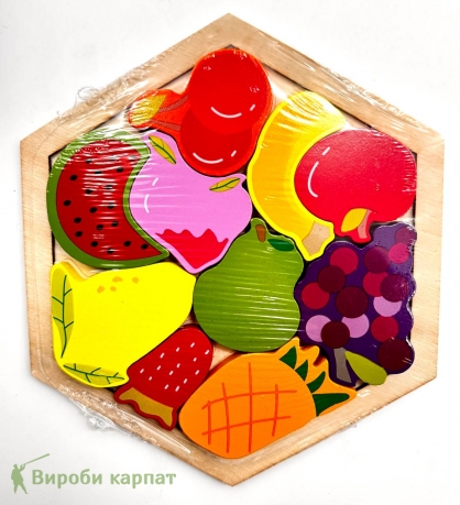 Яркий деревянный пазл с фруктами и ягодами поможет ребёнку изучать формы и цвета. Подходит для малышей: детали крупные, удобные для захвата. Развивает внимание, моторику и визуальное восприятие.