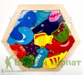 Развивающая игрушка из дерева с яркими морскими обитателями. Детали имеют удобную форму для детских рук, легко вставляются в основу. Пазл способствует развитию моторики, воображения и координации рухов у детей.