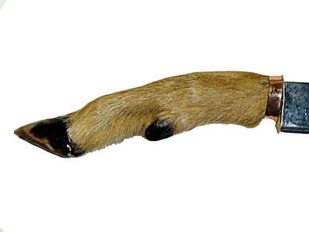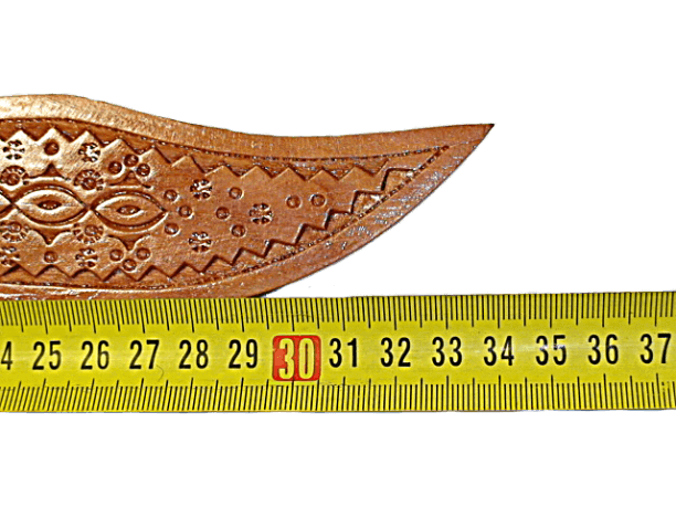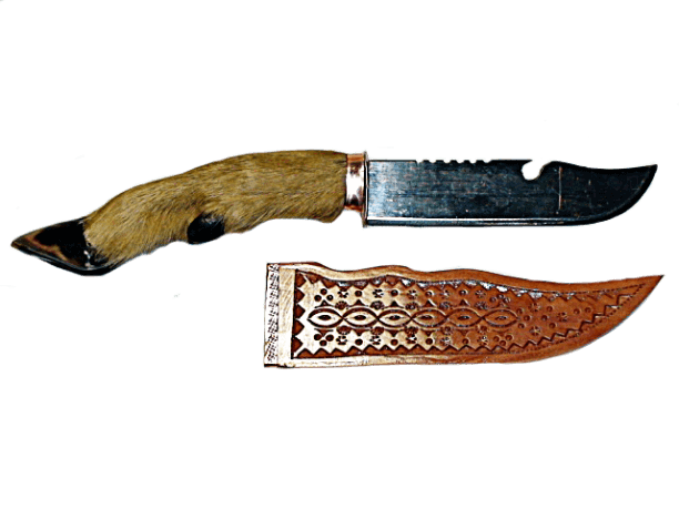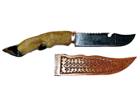 Гуцульский нож. Рукоятка - козья ножка, лезвие - нержавеющая сталь. Ножны деревянные, декорированы резьбой по дереву с этническим орнаментом.