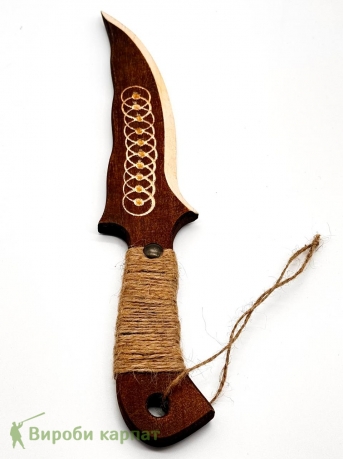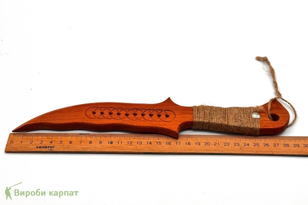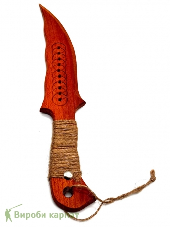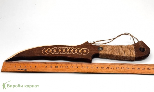 Декоративный нож ручной работы из натурального дерева с вырезанным орнаментом и джутовой обмоткой на ручке. Необычный и безопасный сувенир для коллекции, подарка или тематического оформления. Приятный на ощупь, с народним колоритом.