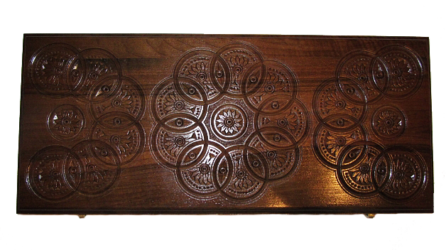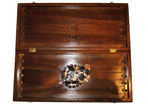 Нарды ручной работы, с элементами ручной резьбы. Для изготовления используются такие породы дерева как черешня, орех, груша. Размер в раскрытом положении приблизительно 50х44 см.