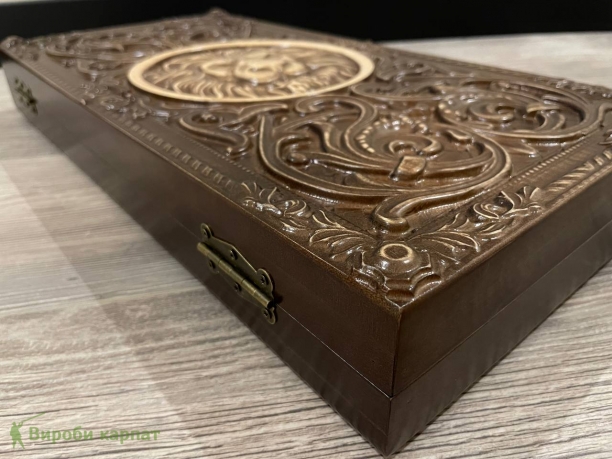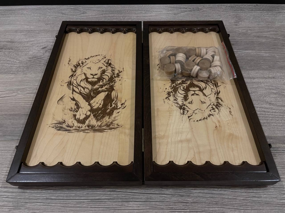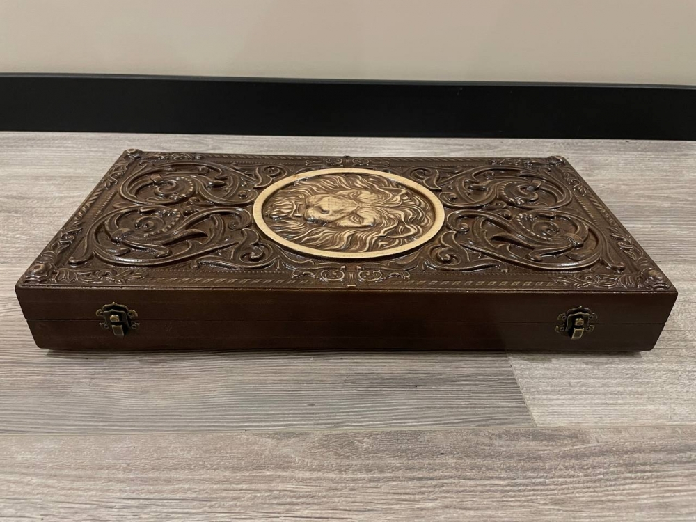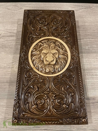 Деревянная нардовая доска с резным львом, изысканное сочетание искусства игрового ремесла и символики силы и мудрости. Образ льва, выбитый на доске, придает игре особый символический смысл и создает загадочную атмосферу. Этот набор не только прекрасный игровой аксессуар, но и изящный предмет декора, который украсит любое помещение своей красотой и глубиной.