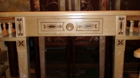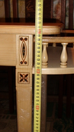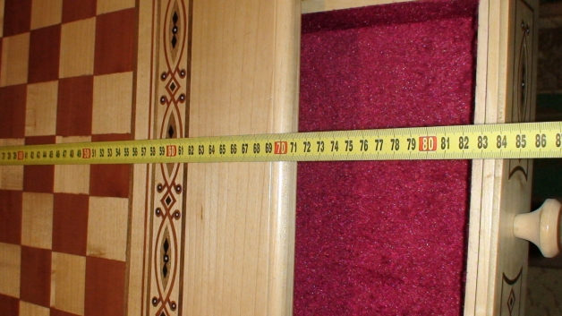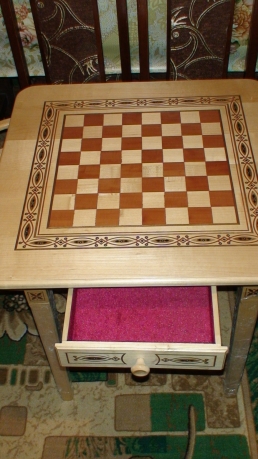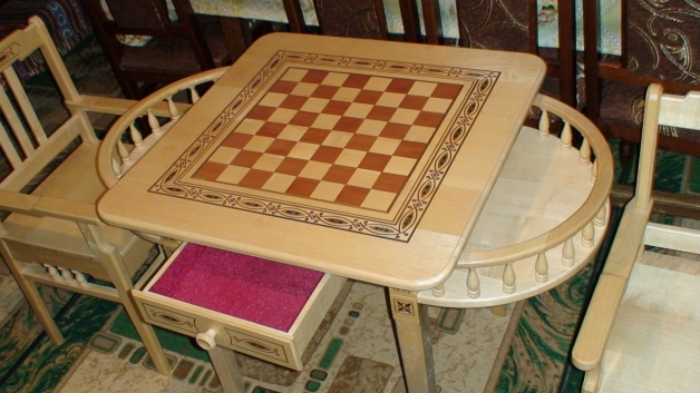 Шахматный стол с инкрустацией. В комплекте стол, два стула. Изготовлен из явора. Имеет выдвижной ящик для хранения фигур, секцию для укладки фигур во время игры. Параметры стола и стула, можно просмотреть на загруженных фото.