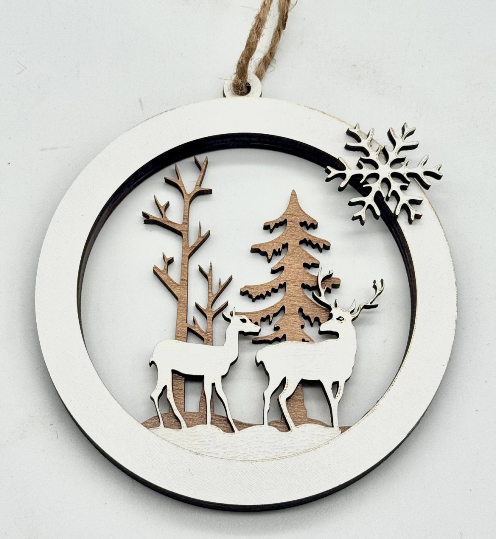 Деревянное украшение “Олени в зимнем лесу” (трёхслойное)