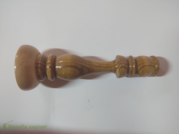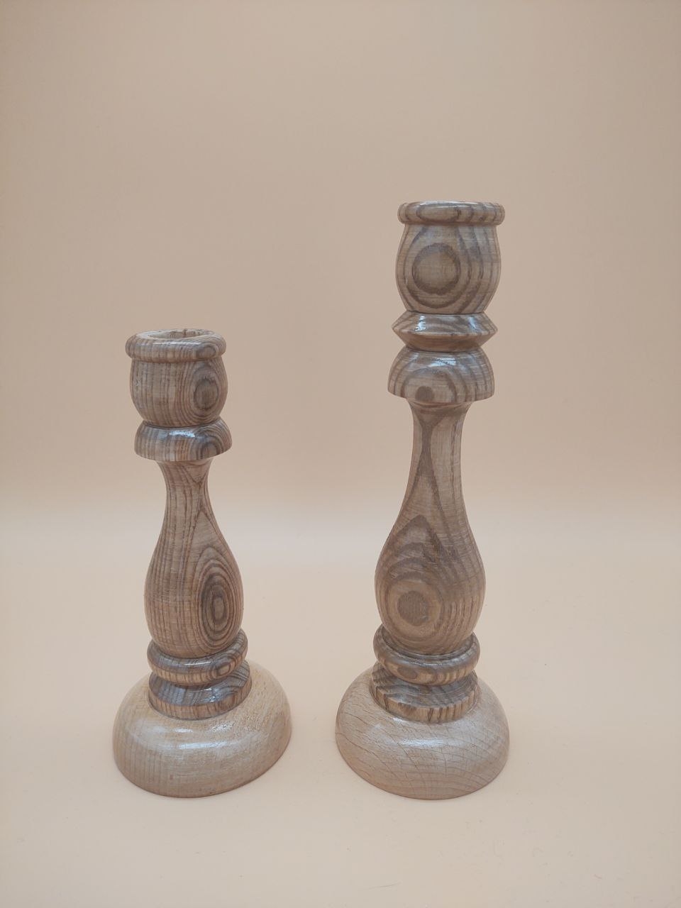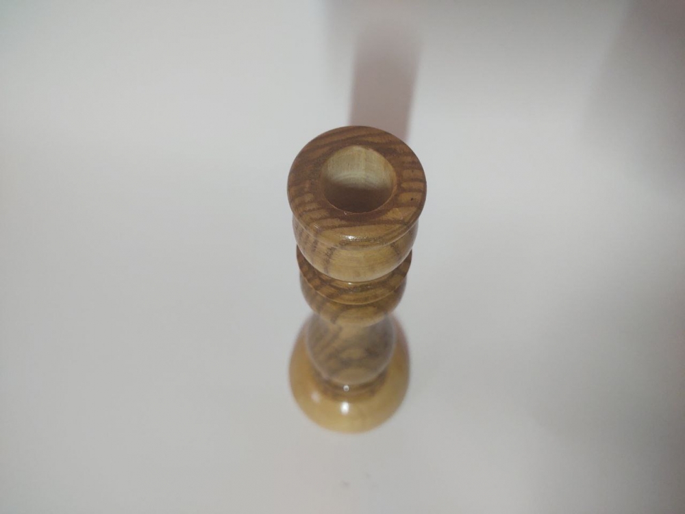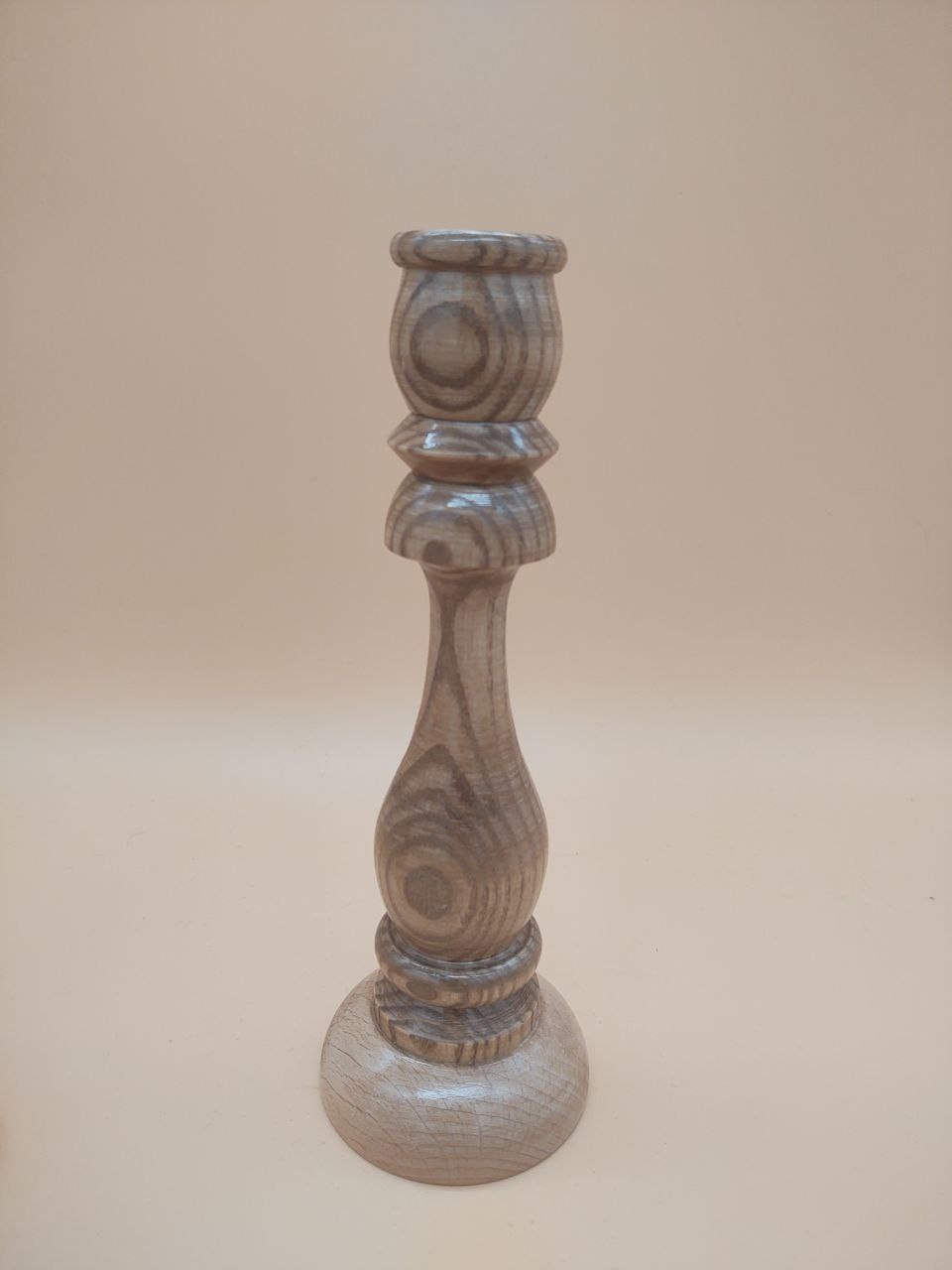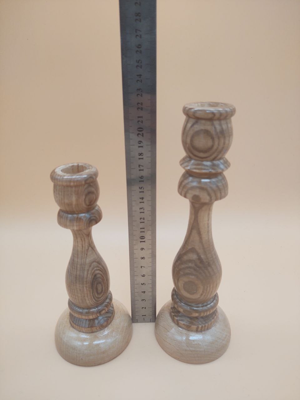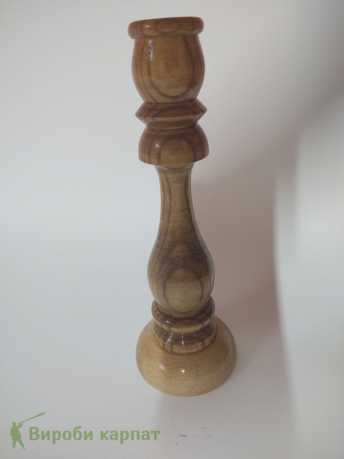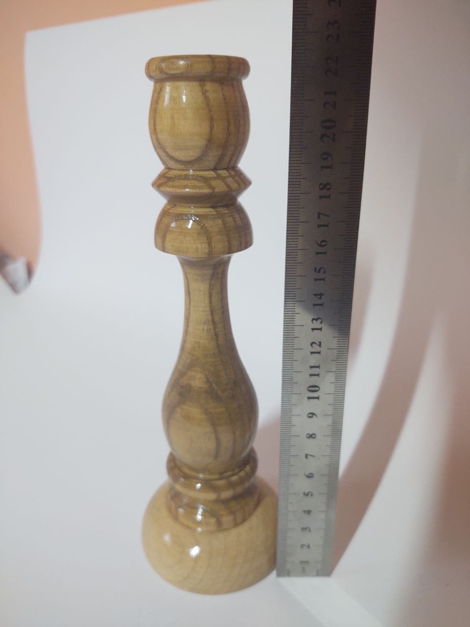 Деревянный подсвечник, высотой 22 см, диаметр под свечу составляет ориентировочно 1,2 см. Материал подставки бук, для подсвечника используется дуб, но может быть и другой материал, в зависимости от наличия сырья. Ручная работа, изделие покрыто лаком.