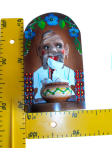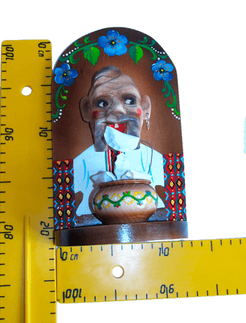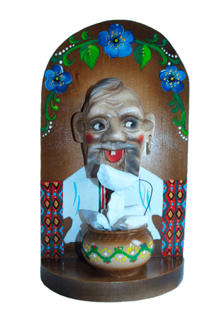 Деревянное панно ручной работы. На этом панно изображен Пузатый Пацюк. Пацюк сидит в своей избе на полу по-турецки, перед ним деревянная миска со сметаной и варениками.
