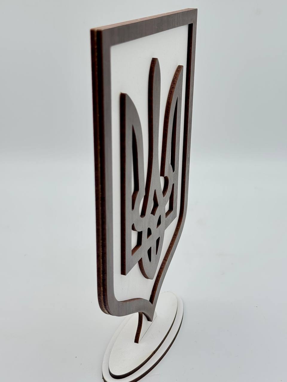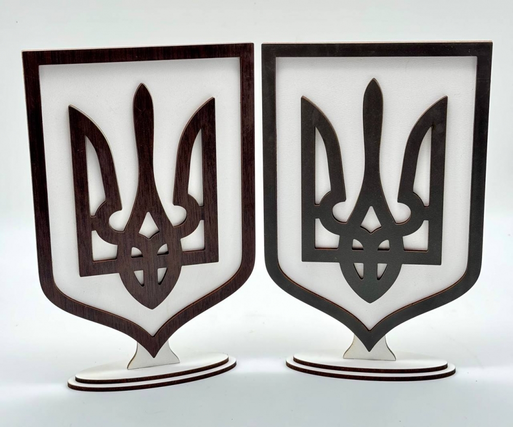 Стильный декоративный герб с трезубцем. Имеет удобную подставку, позволяющую разместить его на столе, полке или любой горизонтальной поверхности. Идеальный подарок или патриотический декор для дома и офиса.