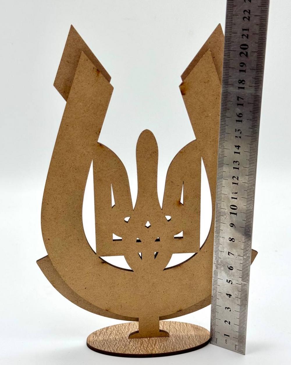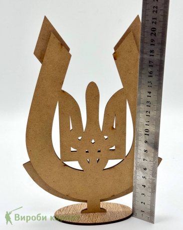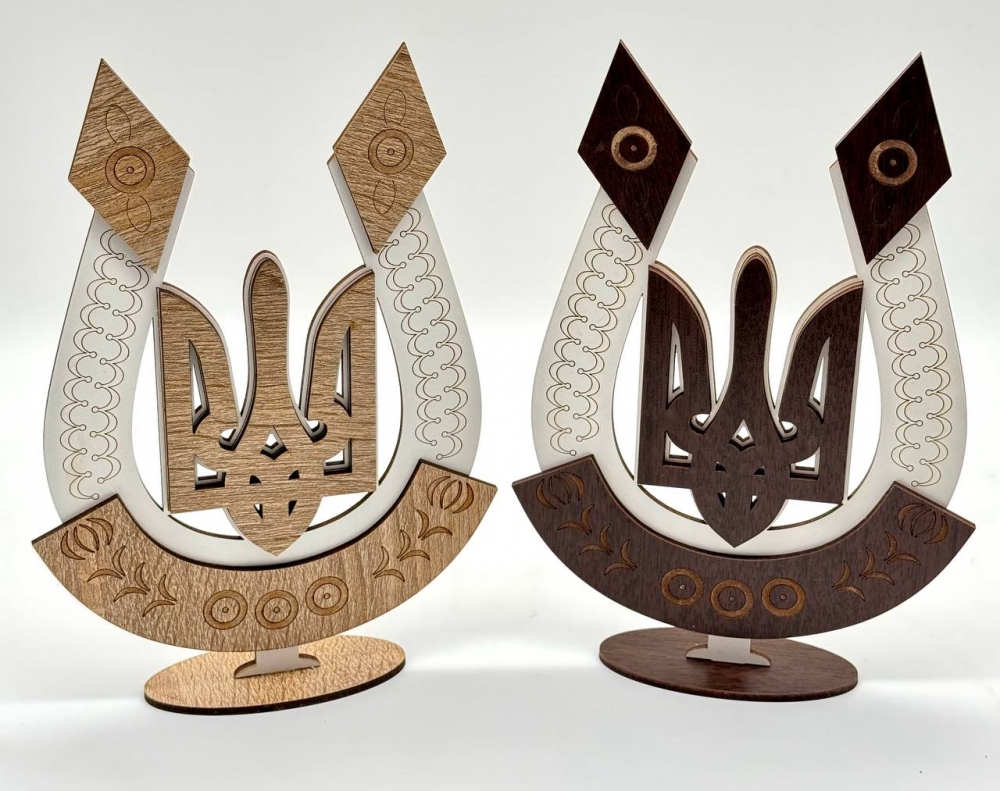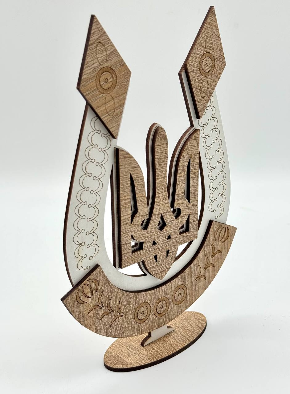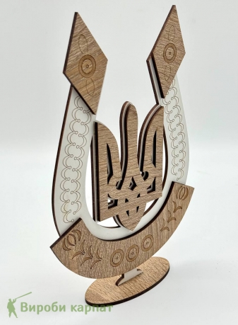 Декоративный сувенир в форме украинского трезубца с подставкой. Элегантное сочетание натуральных оттенков дерева и белого цвета создает стильный акцент в любом интерьере. Прекрасно подходит как патриотический подарок или украшение для дома или офиса.