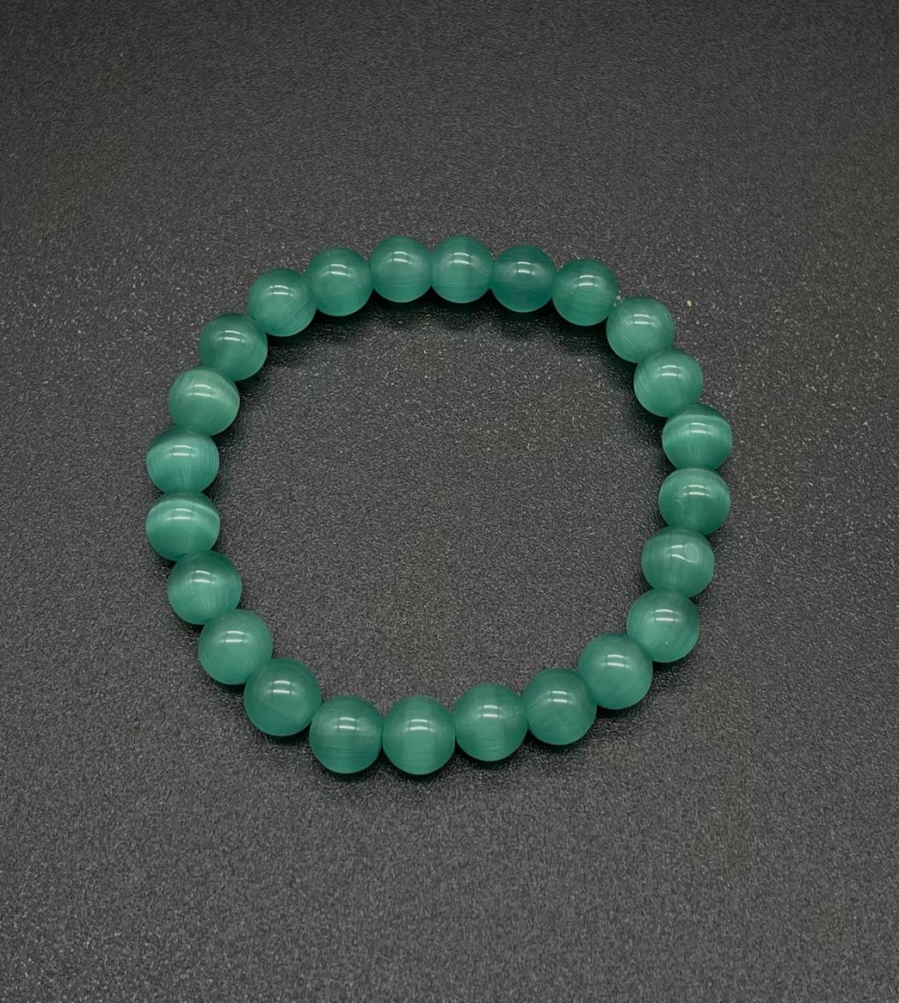 Браслет "Зелёный кошачий глаз" 8 мм – элегантное украшение из камня кошачий глаз насыщенного зелёного цвета. Благодаря природному отблеску камня создаётся эффект глубины и мерцания. Универсальный дизайн делает браслет идеальным аксессуаром как для повседневного ношения, так и для особых случаев. Эластичная основа обеспечивает комфортное прилегание на запястье.