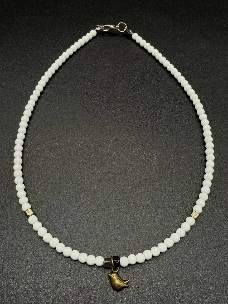 Нежное белое этно-ожерелье с миниатюрной подвеской в виде птички. Создано для тех, кто ценит символику свободы и лёгкости. Идеальное дополнение к этническому или повседневному образу