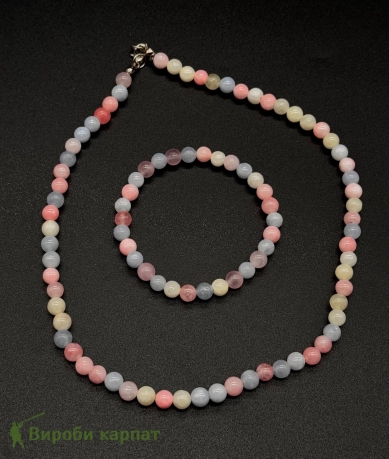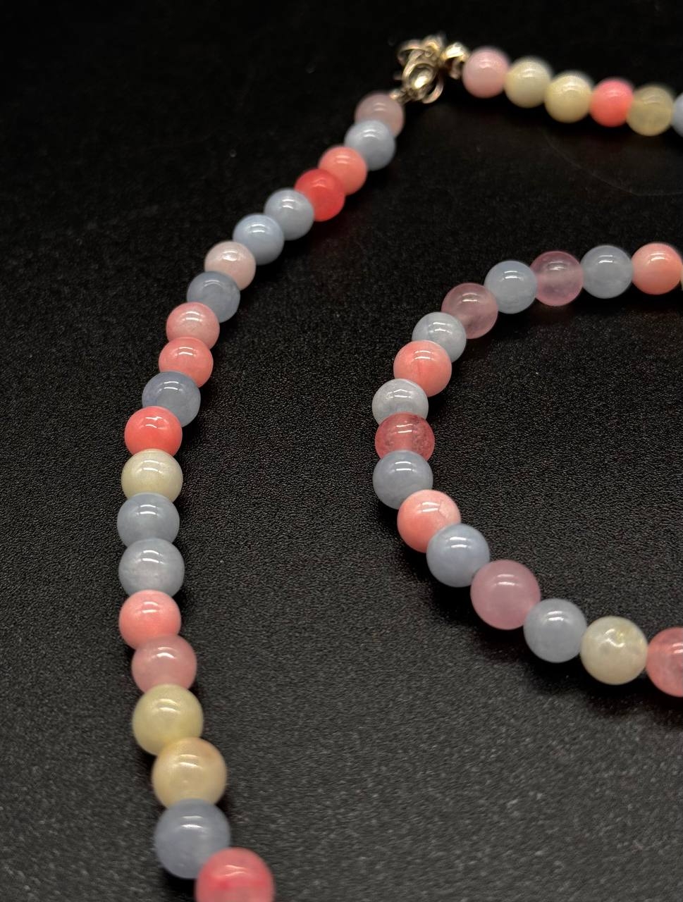 Нежный комплект из бус и браслета из натурального агата. Бусины в пастельных тонах — розовый, сиреневый, голубой и кремовый — создают мягкий и гармоничный образ. Элегантный аксессуар к любому стилю.