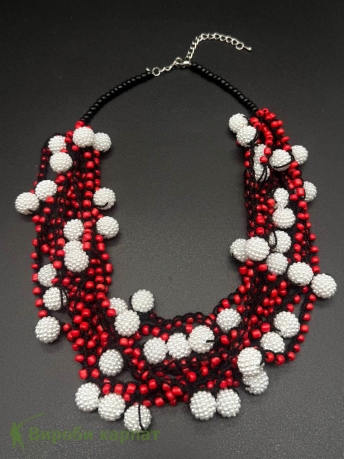 Эффектное ожерелье из плетёных бусин в контрастных цветах: красный, чёрный и белый. Сочетание кружевной основы и блестящих акцентов создаёт изысканный образ с характером